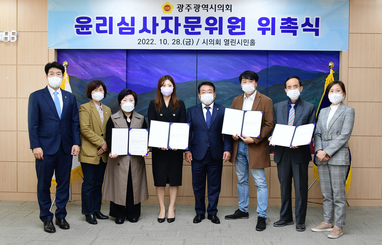 이날 위촉된 김수지(변호사, 민변 광주전남지부 사무차장), 김현(광주전남민주언론시민연합 사무국장), 문기전(광주YMCA 사무총장), 최홍엽(조선대학교 교수) 자문위원은 앞으로 2년 동안 의원의 겸직 및 영리행위 등에 관한 자문과 윤리특별위원회 의원 징계에 관한 자문을 한다.