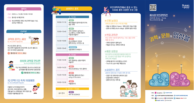 ◈ 개막식은 4.12. 10:00, '제24회 부산과학기술상' 시상식 등 열려… [부산 세계타임즈=이용우 기자] 부산시(시장 박형준)는 오는 4월 12일과 13일 양일간 벡스코 제1전시장에서 '제24회 부산과학축전(이하 과학축전)'을 개최한다고 밝혔다.