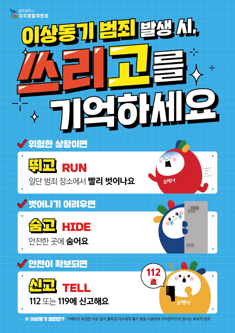 - 광주자치경찰위원회, 3단계 시민 행동요령 제작·배포 [광주 세계타임즈=손권일 기자] 광주자치경찰위원회는 최근 이상동기 범죄 등 잇따른 강력범죄로부터 시민 스스로 안전을 확보할 수 있도록 행동지침을 담은 ‘이상동기 범죄 대응 시민 행동요령’을 제작·배포한다.