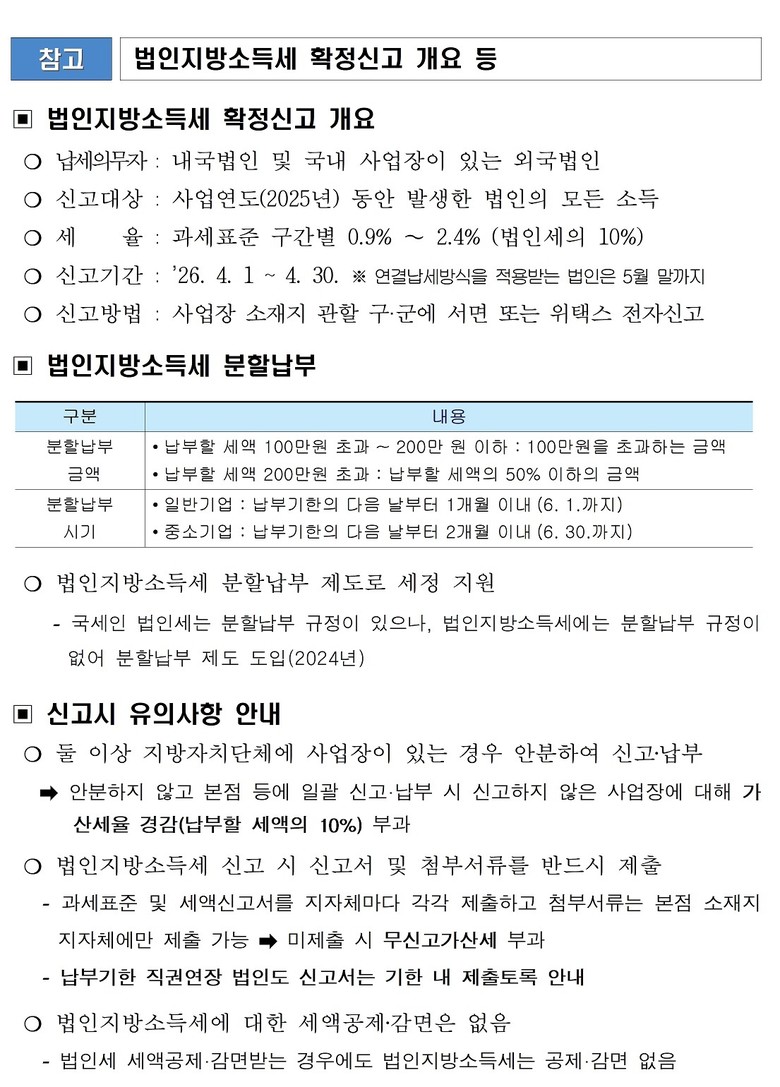 이경덕 시 재정관은 “기업 활력을 제고하고 영세법인 부담 완화를 위해 납부할 세액이 100만 원 초과 시 분할납부가 가능하며, 방문 신고보다 편리하고 신속한 전자신고(위택스)를 이용해 줄 것을 당부드린다”라고 전했다.