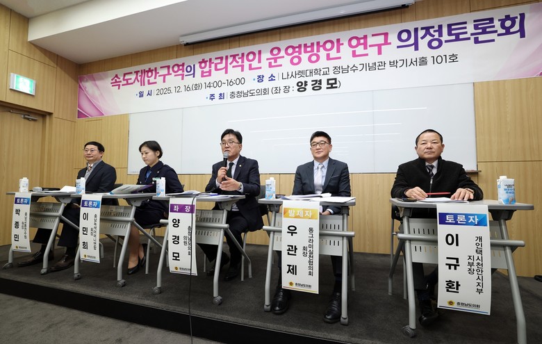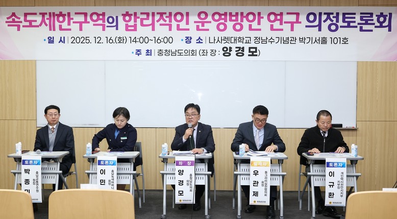 이번 토론회는 양경모 의원(천안11‧국민의힘)이 좌장을 맡았으며 도내 교통안전 정책의 현장 적합성을 높이고 속도제한구역 지정과 운영 과정에서 나타나는 실질적 문제점을 점검하기 위해 마련됐다. 특히 보행자 안전 확보와 운전자 불편 최소화 사이의 합리적인 기준 마련에 초점을 맞췄다.
