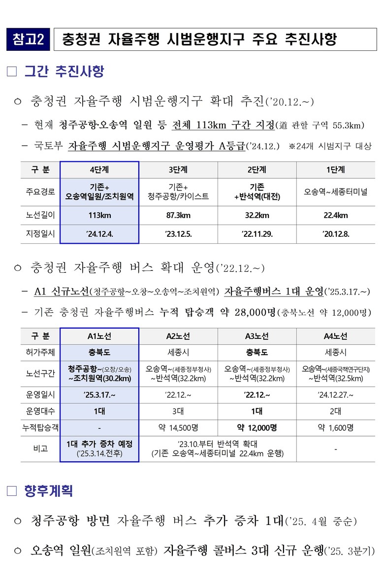 이번에 확대되는 A1 노선은 충청권 자율주행 노선으로 조치원역을 출발해 오송역~오창프라자~청주국제공항까지 운행한다. 우선적으로 3월에 자율주행버스 1대를 사전 운행하고, 4월부터 본격적으로 1일 2대, 왕복 4회 운행한다.