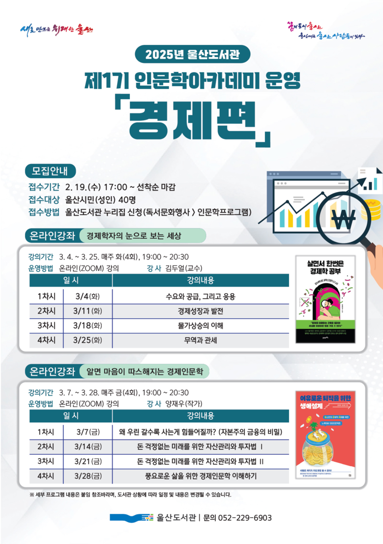 2월 19일부터 울산도서관 누리집서 선착순 접수 [울산 세계타임즈=이호근 기자] 울산도서관은 오는 3월 4일부터 28일까지 ‘2025년 제1기 인문학 아카데미 경제편’ 강좌를 운영한다고 밝혔다.