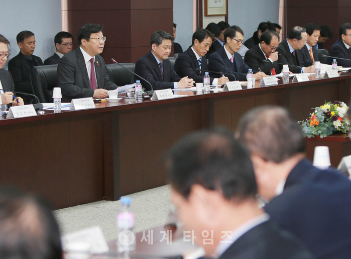 주형환 산업통상자원부 장관이 12일 오전 서울 종로구 한국무역보험공사에서 열린 '2017년 제1차 공공기관장 회의'에서 공공기관장들과 회의를 하고 있다. 2017.01.12.(사진=산업통상자원부 제공)