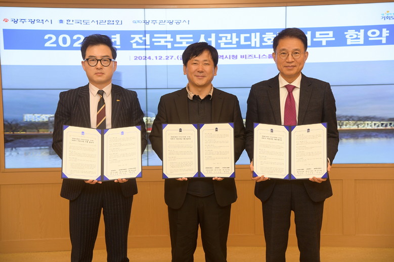광주광역시(시장 강기정)는 27일 시청 비즈니스룸에서 한국도서관협회, 광주관광공사와 ‘제63회 전국도서관대회‧전시회 개최지 지원사항 이행 협약’을 체결했다.