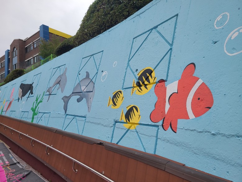 여러 가지 바다 동식물을 주제로 초등학생들의 눈높이를 고려하여 오르막길 벽면을 생기있고 아름답게 디자인하였다. 학교와 지역사회가 함께하는 이번 벽화 그리기 활동으로 학교 등굣길 교육환경 개선은 물론 지역 주민들에게도 볼거리를 제공하였다.