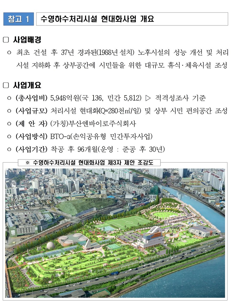 ◈ 시, 우선협상대상자가 선정된 만큼 2026년 착공을 목표로 차질 없는 추진은 물론 향후 협상 과정에서 철저한 검증을 통해 시 재정부담 최소화 방안을 마련하고, 상부 공간은 파크골프장, 어린이 [부산 세계타임즈=이용우 기자] 부산시(시장 박형준)는 오늘(29일) 「수영하수처리시설 현대화사업」 우선협상대상자로 (가칭)부산엔바이로주식회사를 선정했다고 밝혔다.