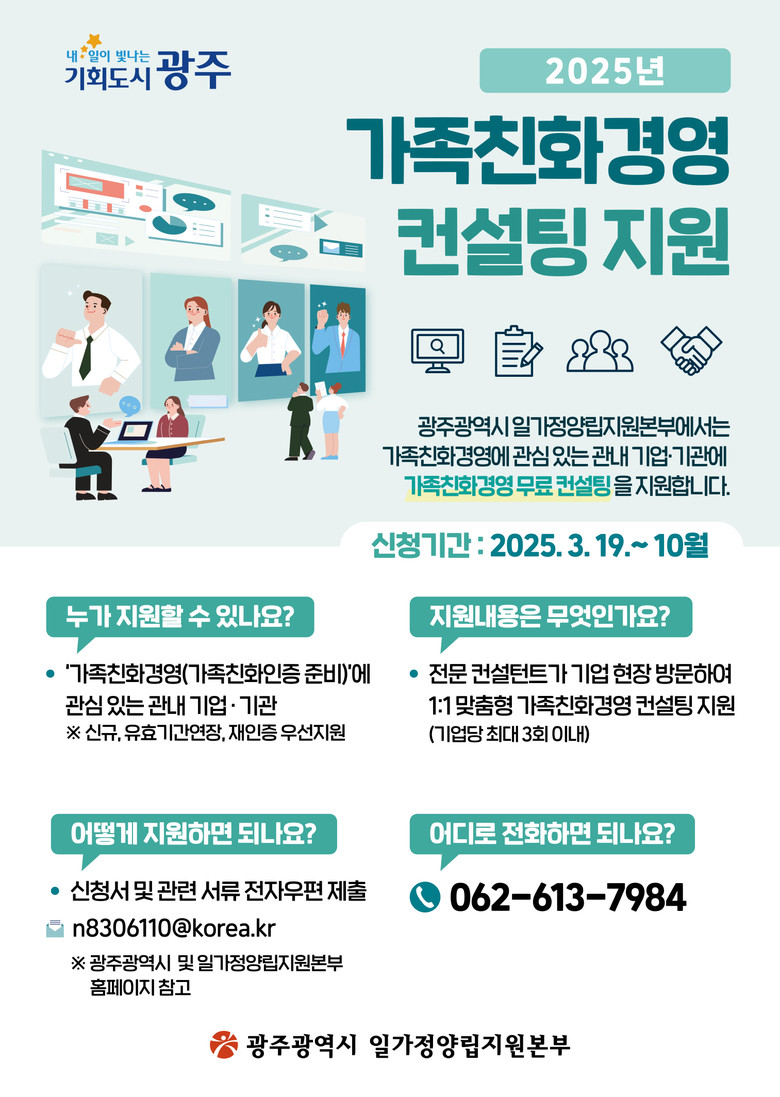 참여를 희망하는 기업·기관은 광주시 누리집 고시·공고 또는 광주일가정양립지원본부 누리집 새소식에서 신청서를 내려받아 작성한 뒤 전자우편(n8306110@korea.kr)으로 신청하면 된다. 지난 19일부터 접수를 시작했으며, 접수 마감은 예산 소진 때까지다.