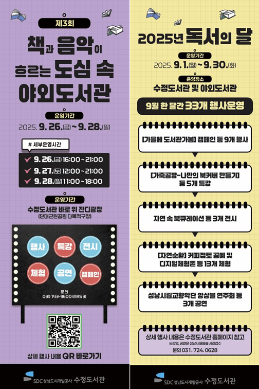 이번 독서의 달 행사는 9월 한 달간 성남시민 누구나 참여할 수 있으며, 자세한 내용은 수정도서관 홈페이지를 통해 확인가능하다.