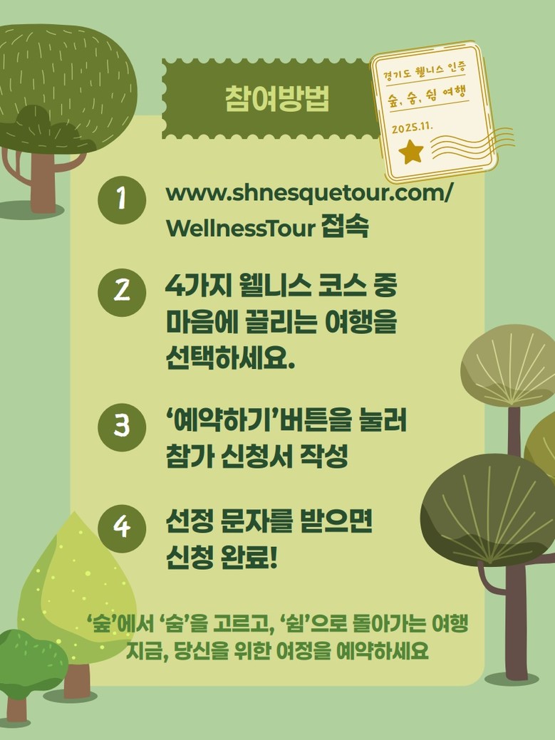 운영은 1박 2일 코스 2회, 당일 코스 4회로 총 6회 진행된다. 주요 코스는 ▲파주 DMZ숲과 평화누리캠핑장, 고양 아쿠아필드를 잇는 ‘숲의 숨결’ ▲양주 육지장사와 시립미술관을 연계한 ‘숨을 고르는 시간’ ▲포천 허브아일랜드와 가평 아침고요수목원을 탐방하는 ‘숨쉬는 정원’ ▲남양주 물맑음수목원과 모란미술관을 아우르는 ‘쉼의 조각’이다.