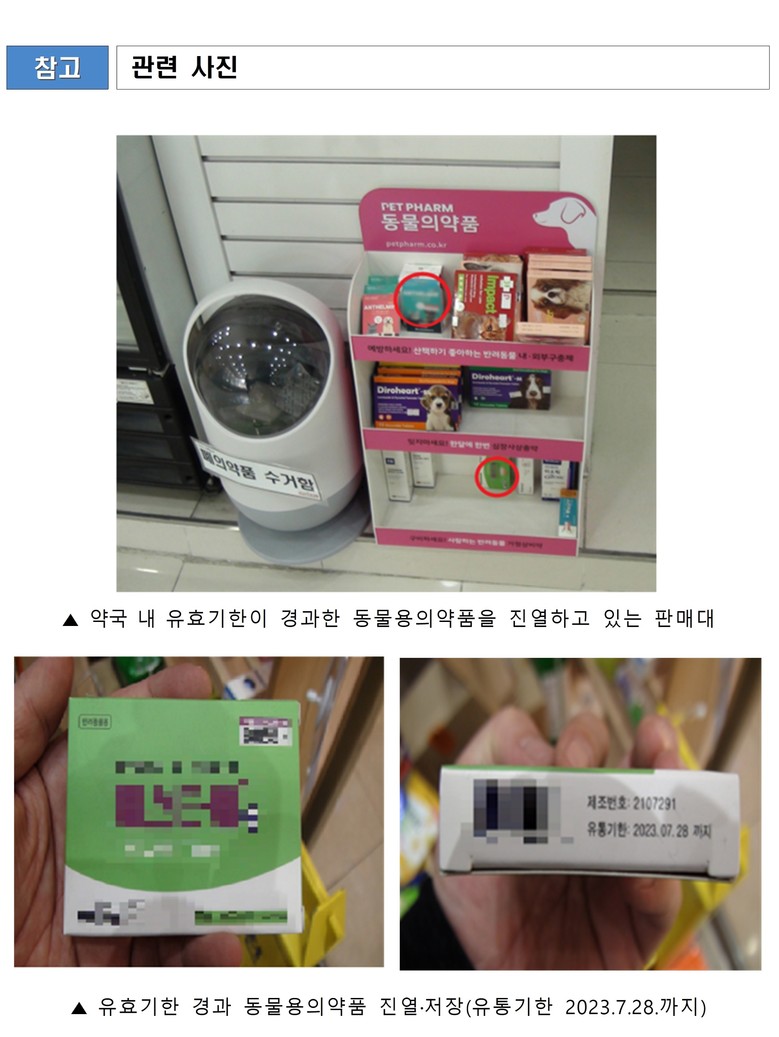 '다' 동물약국은 유효기한이 1년 6개월이 지난 동물용의약품을 판매 목적으로 동물용의약품 판매대에 저장·진열하다가 적발됐다.