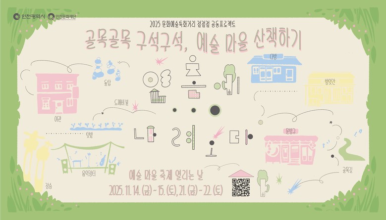 [인천 세계타임즈=심하린 기자] 인천광역시(시장 유정복)와 인천문화재단(대표이사 직무대행 허회숙)은 2025년 11월 14일(금)부터 11월 22일(토)까지 2주간(매주 금·토) 인천 원도심 내 10개 문화공간에서 문화예술특화거리 점점점 공동프로젝트 <인촌에 나려오다>를 개최한다. 이번 행사는 인천 원도심 내 문화공간의 예술활동을 지원하고, 문화공간을 방문하는 시민에게는 다양한 문화예술 프로그램 체험 기회를 제공한다.