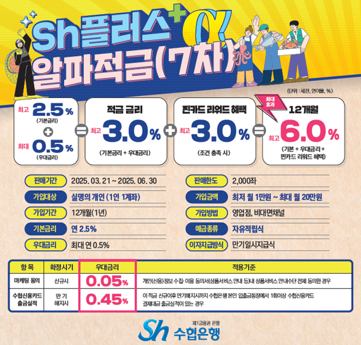 Sh플러스알파적금은 1년 만기 자유적립식 상품으로 월 20만원 이내에서 가입 가능하며 마케팅 활용 동의, 수협 신용카드 결제대금 출금실적 보유 등 우대조건을 충족하면 최고 연 3.0%의 금리를 받을 수 있는 상품이다.