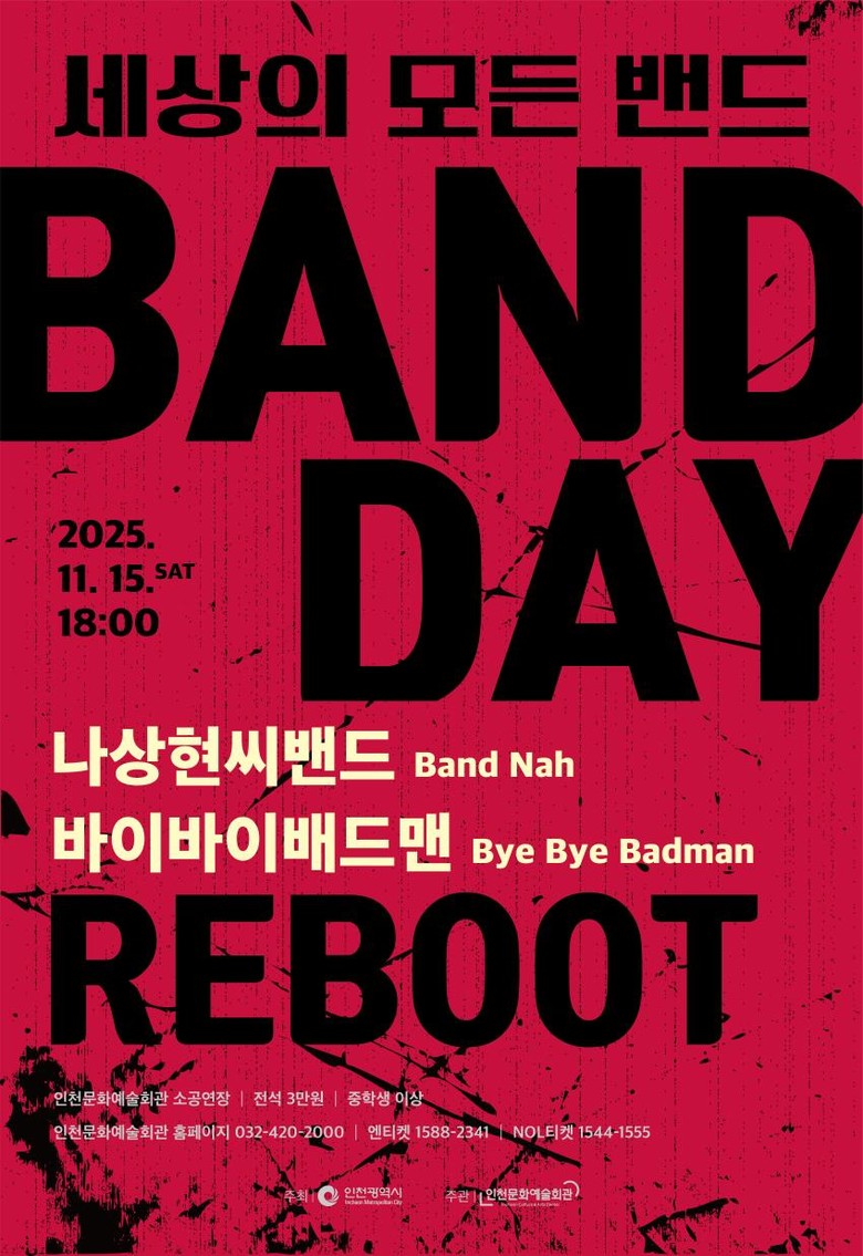 〈2025 밴드데이 : Reboot〉는 전석 3만 원이며 중학생 이상 관람 가능하다. 또한 수험생을 위한 ‘고3 수험생 반값 할인’, 만 13세 이상 24세 이하 관객을 위한 ‘청소년 문화패스 30% 할인’, 그리고 ‘인천시민 20% 할인’ 등 다양한 혜택이 제공된다. 인천문화예술회관 누리집과 엔티켓, 놀티켓에서 예매할 수 있다.