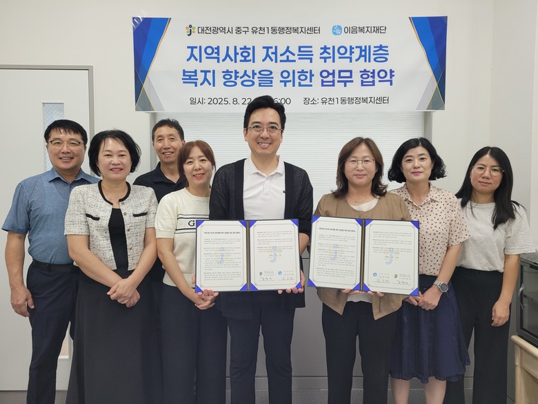 [중구 세계타임즈=이채봉 기자] 대전 중구 유천1동(동장 김성아)은 지난 22일 이음복지재단(이사장 김도열)과 함께 지역 내 저소득 취약계층 주민의 복지 향상과 민관 협력 체계 구축을 위한 업무협약을 체결했다고 밝혔다.
