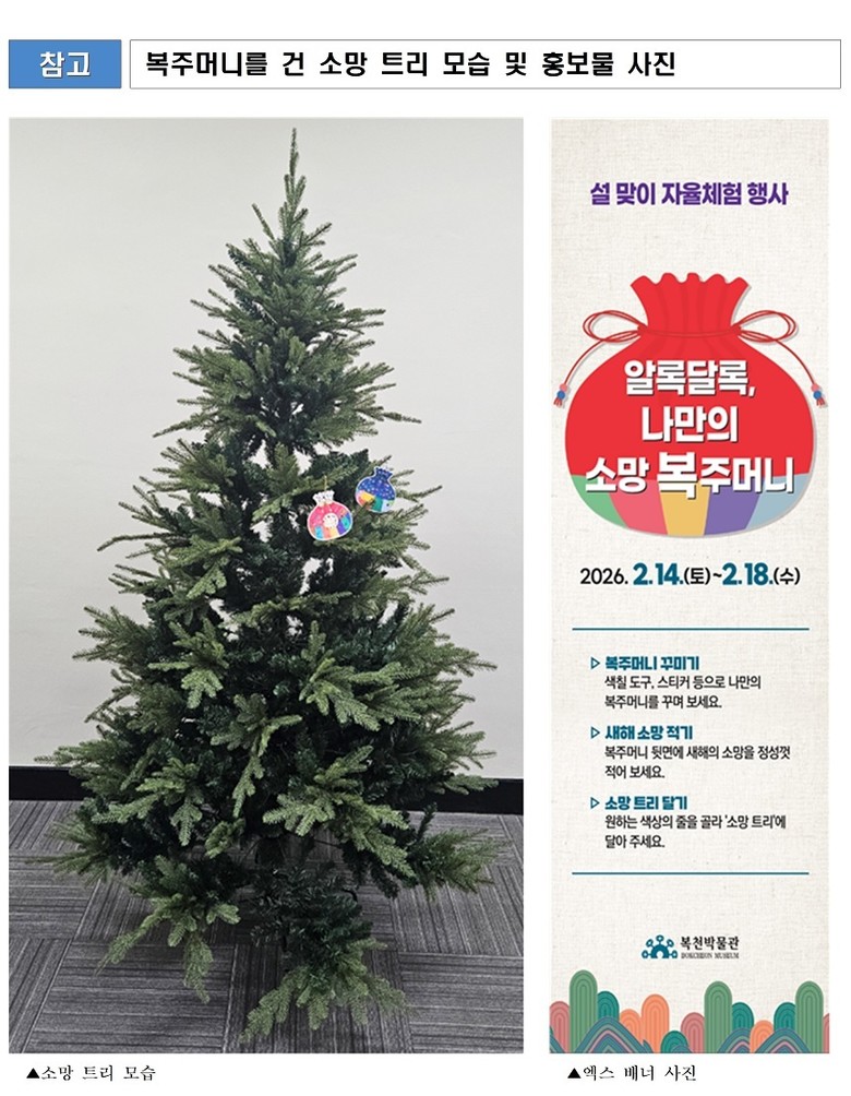 ◈ 직접 꾸민 복주머니에 새해 소망을 담아 트리에 장식하며 한 해의 복을 기원하는 행사 [부산 세계타임즈=이용우 기자] 부산 복천박물관(이하 박물관)은 2026년 설 연휴 기간(2월 14일~18일) 동안 「알록달록, 나만의 소망 복주머니」 행사를 개최한다고 밝혔다.