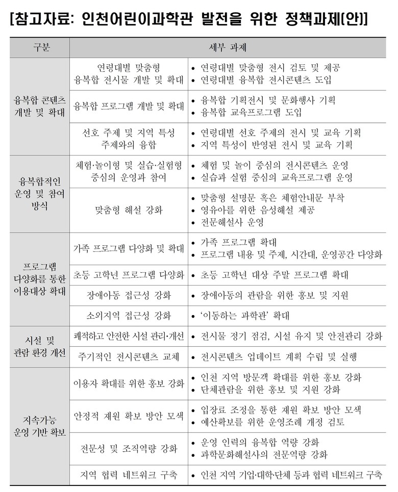 이를 위하여 인천어린이과학관이 지향해야 할 정책 기본 방향으로 ‘융복합 콘텐츠 중심의 과학놀이터’와 ‘수요자 중심의 과학관’을 설정하였다.
