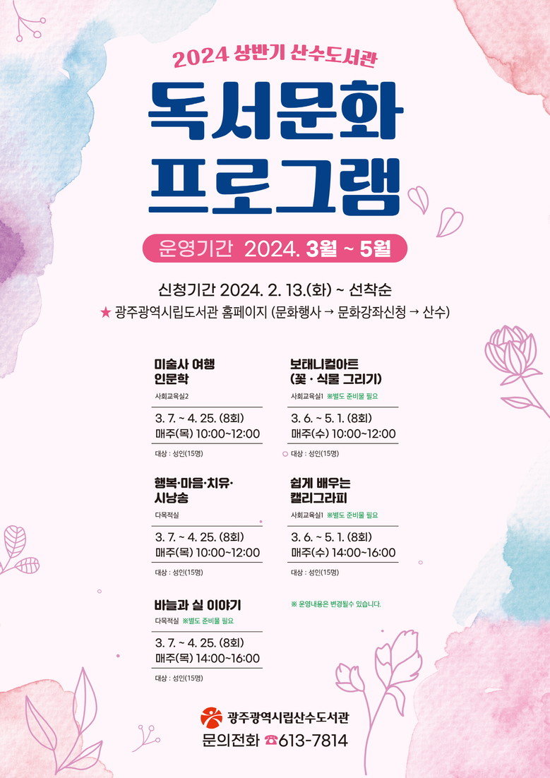 산수도서관은 성인을 대상으로 ▲미술사 여행 인문학 ▲행복·마음·치유·시낭송 ▲바늘과 실 이야기 ▲보태니컬아트(꽃·식물 그리기) ▲쉽게 배우는 캘리그라피 등 5개 강좌를 마련했다.