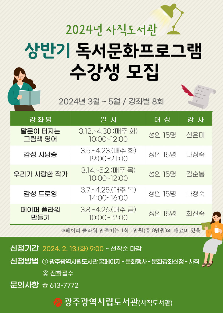 상반기 독서문화 강좌의 수강료는 무료이며, 재료비와 교재비는 수강생이 부담한다. 강좌 수강을 희망하는 시민은 13일부터 광주광역시립도서관 누리집 ‘문화강좌신청’란을 통해 접수하면 된다.