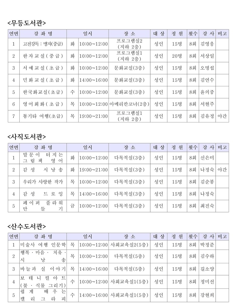 무등·사직·산수 등 3개 도서관에서 운영되는 이번 강좌는 인문고전부터 예술강좌, 외국외회화 등 17개의 다양한 프로그램을 만나볼 수 있다.
