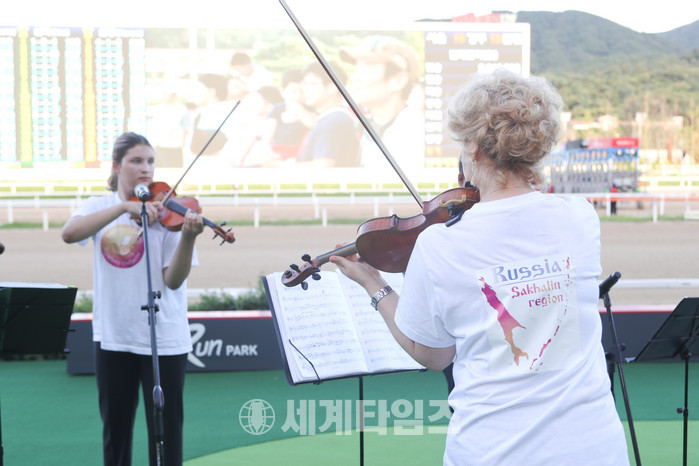 [세계타임즈 임인규기자]한국마사회(회장 이양호) 렛츠런파크 서울 관람대 앞 시상대에서 8월 12일(토) 제9경주 직후(17:40 출발), 11명의 '러시아 사할린 주립 청소년오케스트라'의 공연이 개최돼 눈길을 끌었다.