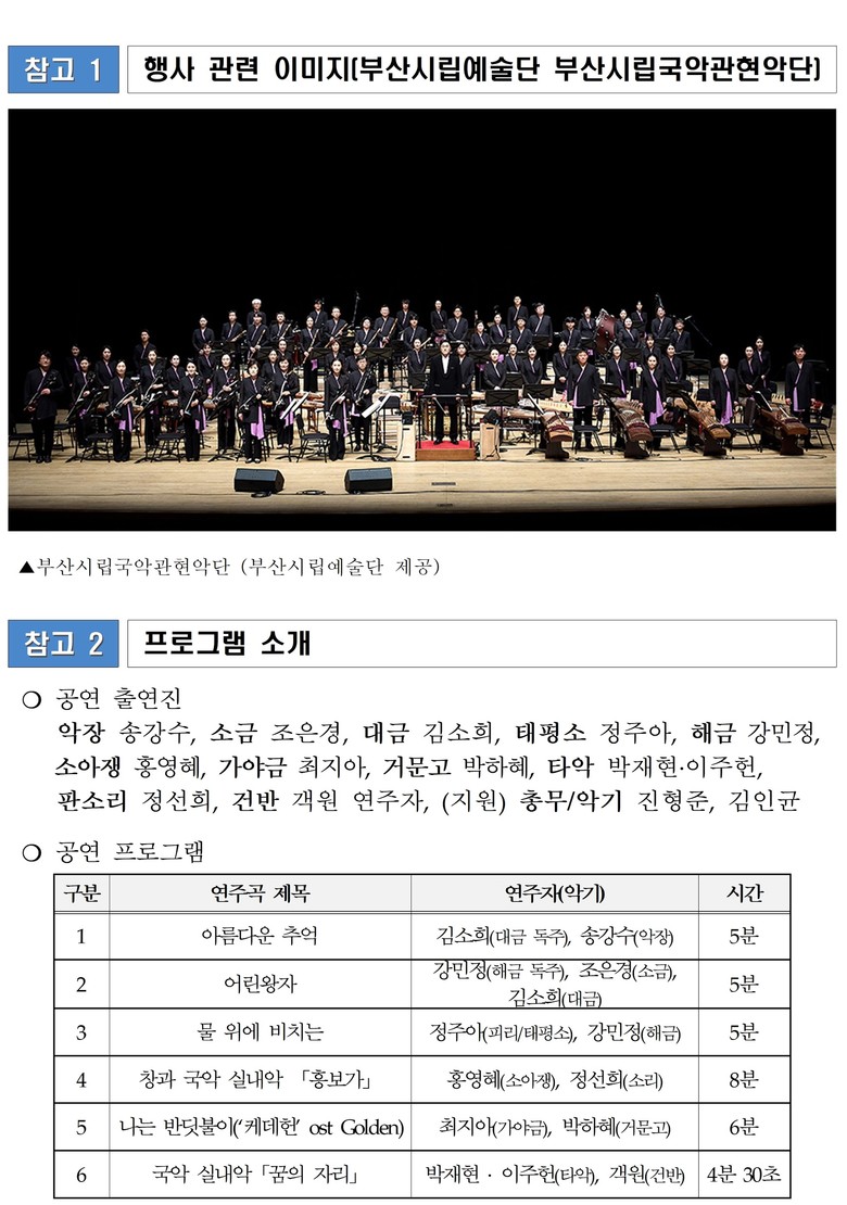 이번 공연에서는 부산시립예술단 국악관현악단의 악장 송강수를 비롯해, ▲조은경(소금) ▲김소희(대금) ▲정주아(태평소) ▲강민정(해금) ▲홍영혜(소아쟁) ▲최지아(가야금) ▲박하혜(거문고) ▲박재현·이주헌(타악) ▲정선희(판소리) 등이 출연해 풍성한 음악적 하모니를 선보인다.