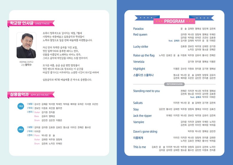 실용음악과 ‘제7회 예술제’ 기획팀장인 세종예술고 2학년 박나린 학생은 “학기 초부터 연주곡을 선곡하고 친구들과 합주하면서 많은 어려움도 있었지만, 관객에게 최고의 음악을 선사하고자 친구들과 함께 정말 열심히 연습했다.”라며, “많은 분이 참석하여 멋진 밴드 하모니가 창조되는 순간을 함께 즐겼으면 좋겠다.”라고 말했다.