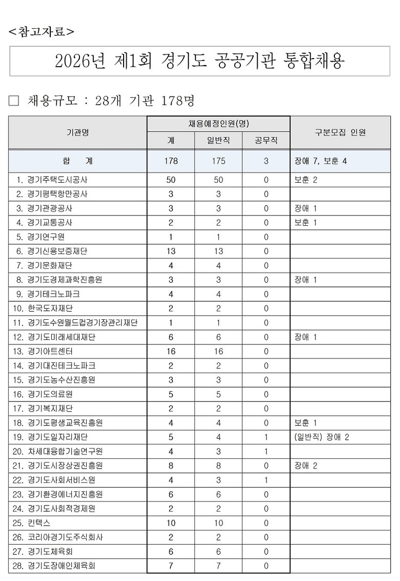 [경기도 세계타임즈=송민수 기자] 경기도가 경기주택도시공사 등 28개 경기도 공공·유관기관 직원 178명을 채용하는 2026년 제1회 통합채용시험을 시행한다.