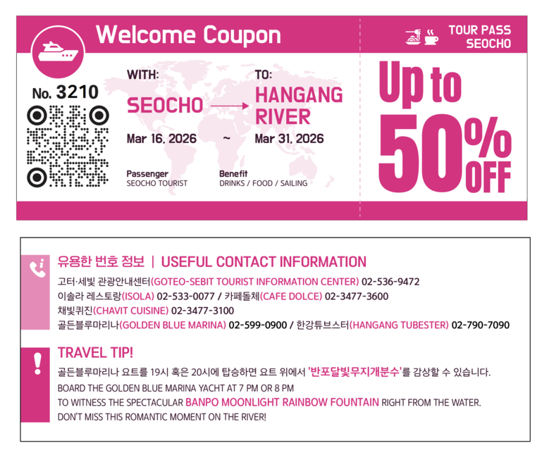주요 혜택으로는 ▲3월 27일부터 운영되는 한강튜브스터 50% 할인 ▲골든블루마리나 요트 20% 할인 ▲이탈리안 레스토랑 ‘이솔라’ 13% 할인 ▲뷔페 레스토랑 ‘채빛퀴진’ 10% 할인 ▲카페돌체 음료 구매 시 에그타르트(3,000원 상당) 또는 쿠키(4,500원 상당) 제공 등으로 세빛섬, 골든블루마리나, 한강튜브스터의 후원을 통해 진행된다.