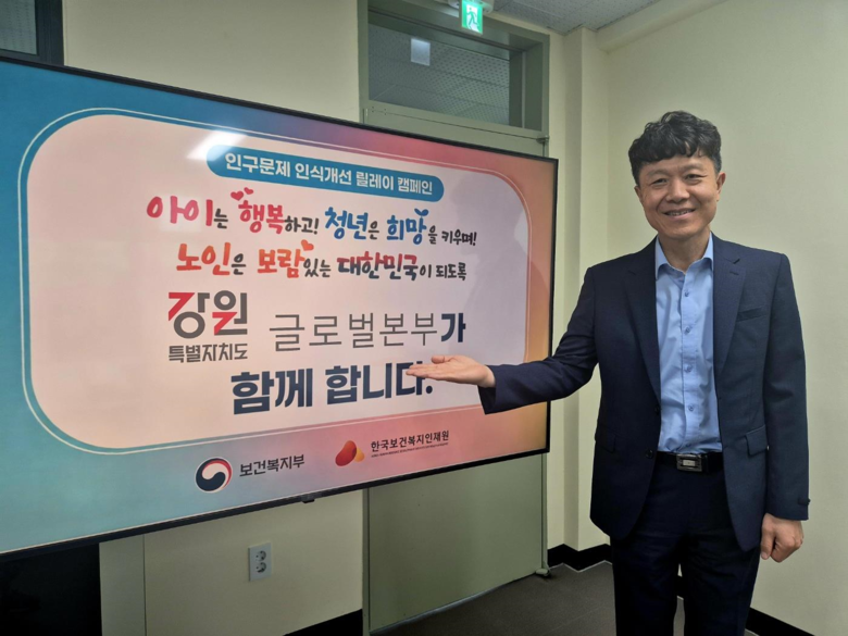 [강원도 세계타임즈=김민석 기자] 강원특별자치도 글로벌본부(본부장 손창환)는 인구감소와 고령화로 인한 사회적 문제에 대한 경각심을 높이고, 국민적 공감과 협력을 유도하기 위해 ‘인구문제 인식개선 릴레이 캠페인’에 참여했다고 밝혔다.