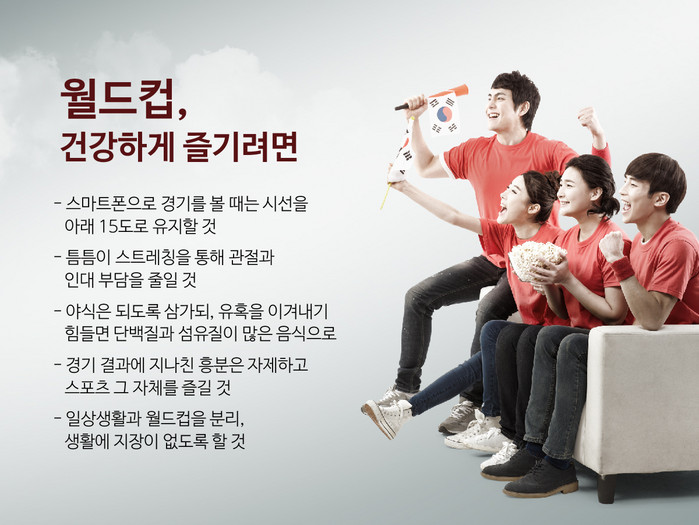 특히 스마트폰 등 모바일 기기로 경기를 관람하는 이들은 자칫 잘못된 자세로 인해 ‘거북목 증후군’을 비롯한 다양한 근골격계 질환을 유발할 수 있다. 더불어 ‘치맥’ 등 야식으로 인한 소화기질환이나 습관적으로 야식을 섭취하는 ‘야간식이장애증후군’을 불러올 수 있다. 국가대항전이라는 월드컵의 특성 상 국가대표팀의 성적에 너무 과몰입, 일상생활에 지장을 주는 경우도 생길 수 있다.