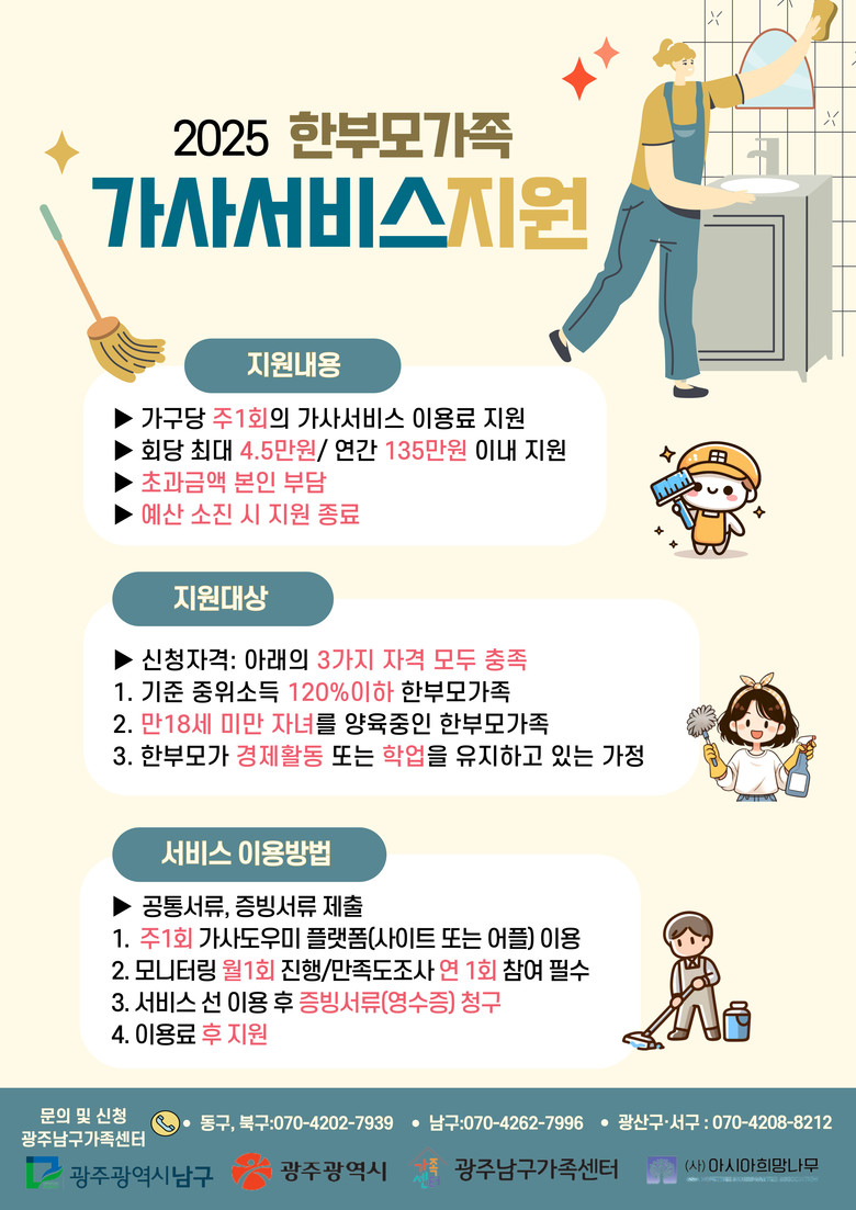 서비스는 시중의 가사도우미 플랫폼(웹 또는 앱)을 통해 이용한 뒤, 영수증을 제출하면 비용을 청구할 수 있다. 이용 가정은 월 1회 모니터링 및 연 1회 만족도 조사에 참여해야 한다. 신청 및 문의는 광주남구가족센터(070-4204-7939, 070-4262-7996, 070-4208-8212)로 하면 된다.