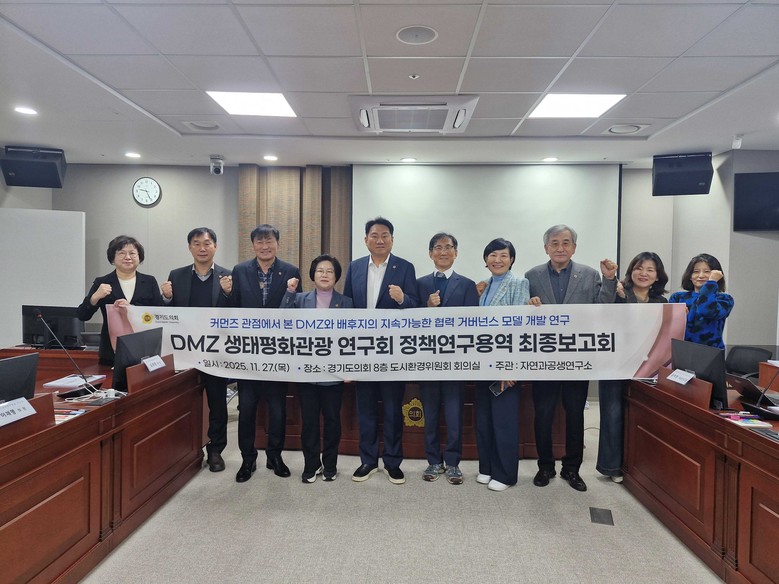 [경기도 세계타임즈=송민수 기자] 경기도의회 의원연구단체인 DMZ생태평화관광 연구회(회장 오준환 의원)는 지난 27일(목) 경기도의회 도시환경위원회 회의실에서 「커먼즈 관점에서 본 DMZ와 배후지의 지속가능한 협력 거버넌스 모델 개발 연구」 용역 최종보고회를 개최했다.