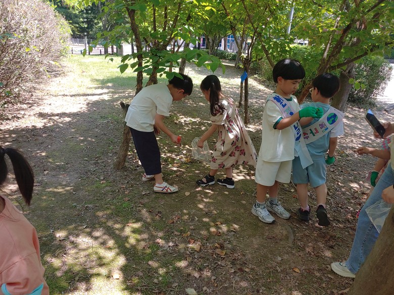 지난 6월 4일은 환경의 날을 맞이하여 형님과 아우가 짝꿍이 되어 학교 주변 통학로와 금잔디 어린이공원 일대를 줍깅(jogging)하였다. 쓰레기 봉투에 담은 쓰레기는 유치원 분리수거함에 짝꿍이 함께 의논하며 분리수거하였다. 줍깅(jogging)에 참여한 1학년 학생은 “아빠에게 앞으로 절대 담배 피우지 말라고 얘기할 거예요. 공원에 담배 쓰레기가 너무 많았어요.”라고 이야기하였다. 다가오는 9월 6일 자연순환의 날에는 일주일 동안 병뚜껑을 함께 모으고 재활용하는 ‘병뚜껑의 변신’ 활동을 함께 하기로 계획하고 헤어졌다.
