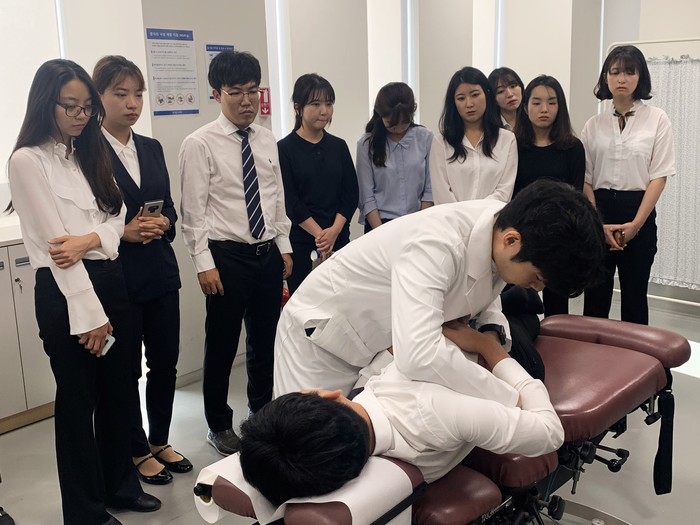 | ▲자생한방병원을 방문한 한의대 4학년 학생들이 자생 비수술 치료법 교육을 받고 있다. |