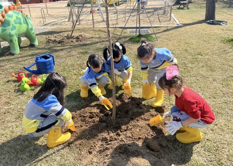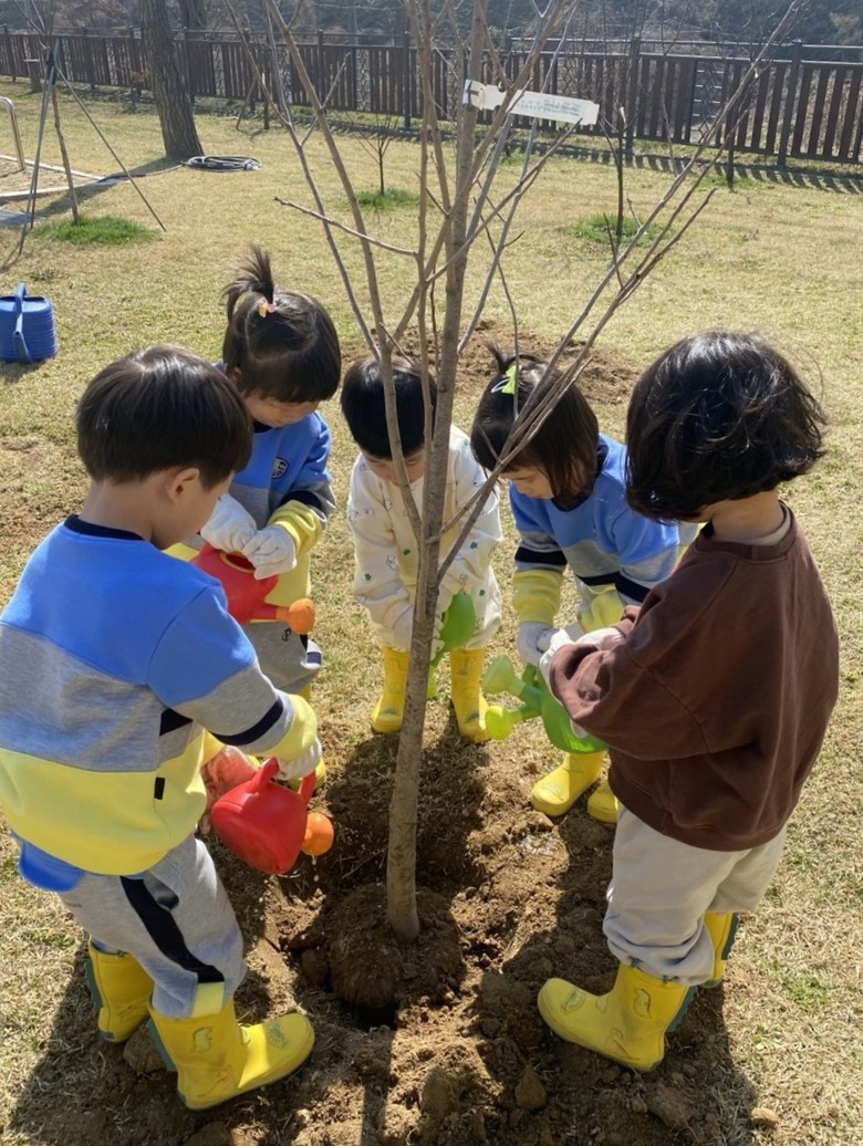 학급별로 포포나무, 앵두나무, 개암나무, 산수유나무를 하나씩 정해 함께 흙을 옮기고 물뿌리개로 물도 흠뻑 줘보며, 친구들과 함께 학급 나무를 심어 보는 소중한 시간을 가졌다. 나무를 심으며 유아들은 “나무가 잘 자라려면 햇빛이 필요해.”, “그럼 날씨가 빨리 따뜻해졌으면 좋겠다. 그래야 햇빛이 더 강해지잖아” 하며 나무가 잘 자랐으면 하는 마음을 표현하였다. 또한 반 친구들과 함께 학급 나무를 보며 “바깥놀이 나올 때마다 얼마나 잘 자랐나 보러 오자.”는 귀여운 약속을 하기도 했다.
