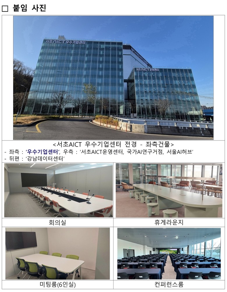 한편, 서초구는 양재‧우면 일대가 2024년 전국 최초 ‘AI 미래융합혁신특구’로 지정되고, 지난 21일 그 배후지 역할을 할 ‘양재ICT특정개발진흥지구’까지 서울시에서 최종 지정결정되면서 특구와 진흥지구로 이어지는 AI 산업벨트를 완성한 바 있다. 또, 이곳에는 강남데이터센터, 국가 AI 연구거점, 서울 AI 허브, KAIST AI대학원과 현대·기아·삼성·LG·KT 등 대기업 연구소가 밀집된 만큼 우수기업센터 입주기업의 네트워킹과 기술협력 기반의 시너지가 효과가 전망된다.