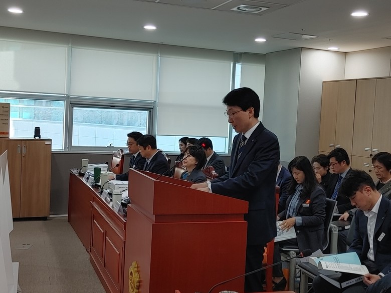 | ▲행감 업무보고 발표하는 김민철 경상원장 및 피감 관계자들 모습. |