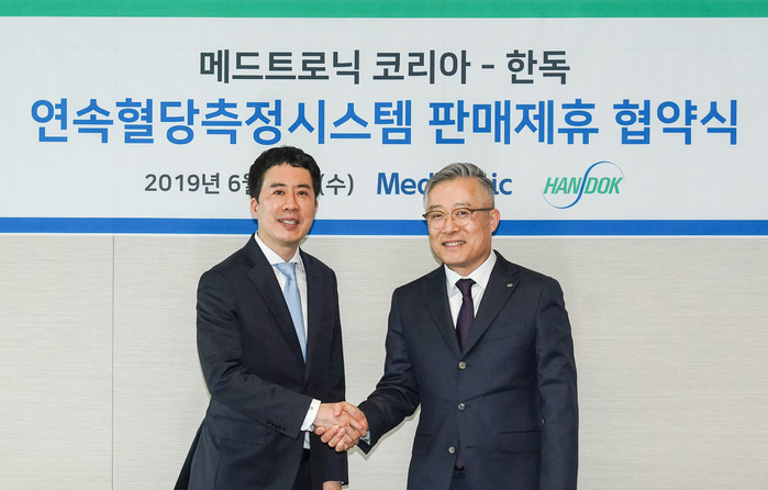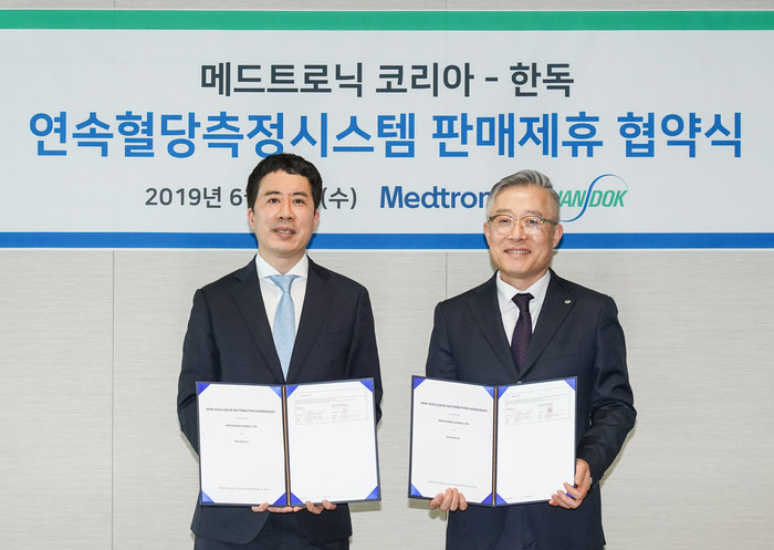한독(대표이사 김영진, 조정열)과 메드트로닉코리아(대표 허준)가 연속혈당측정기(CGM)의 국내 판매 제휴 계약을 12일 체결했다. 한독은 이번 계약을 통해 전국 병의원에서 메드트로닉의 연속혈당측정 시스템, ‘가디언커넥트(Guardian™Connect)’와 ‘아이프로2(iPro™2)’의 마케팅과 유통을 담당하게 된다.