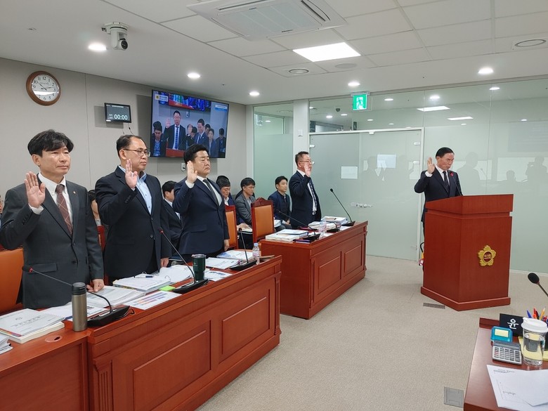 | ▲이원성 경기도체육회장 및 피감기관 관계자들 증인선서 모습. |