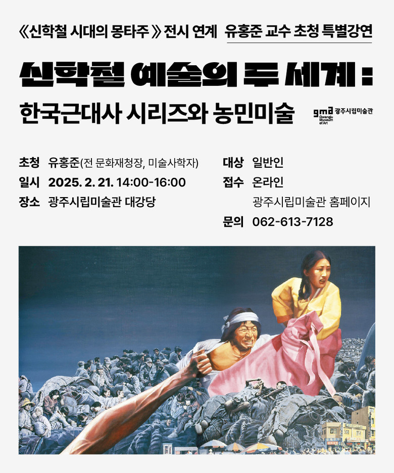 ‘신학철 예술의 두 세계 : 한국근대사 시리즈와 농민미술’를 주제로 한 이번 강연에서 유홍준 교수는 우리나라 근현대 시대상과 함께 급변하는 시대 흐름 속에서 중산층과 소시민들을 주인공으로 내세워 그들의 삶을 표현한 신학철 작가의 예술작품을 조명한다.
