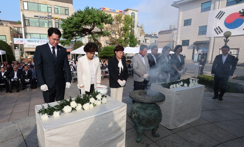 행사는 국민의례를 시작으로 헌화와 분향, 광복절 노래 제창, 만세삼창 순으로 엄숙하고 경건하게 진행되었으며, 의원들은 각자의 마음을 모아 기념탑에 헌화하고, 나라의 독립을 위해 희생한 선조들의 정신을 되새기며 참배의 뜻을 다졌다.