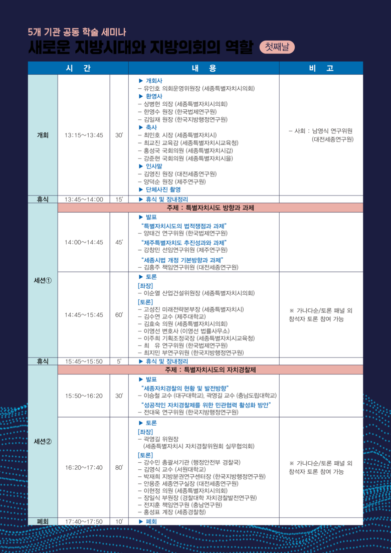 세미나는 세종시의회 의회운영위원회(위원장 유인호)와 함께 한국법제연구원, 한국지방행정연구원, 대전세종연구원, 제주연구원 등 5개 기관의 공동주최로 정부세종컨벤션센터 VIP 라운지에서 개회식을 시작으로 총 3개 세션으로 나누어 기조 발제 후 토론 순으로 진행된다.