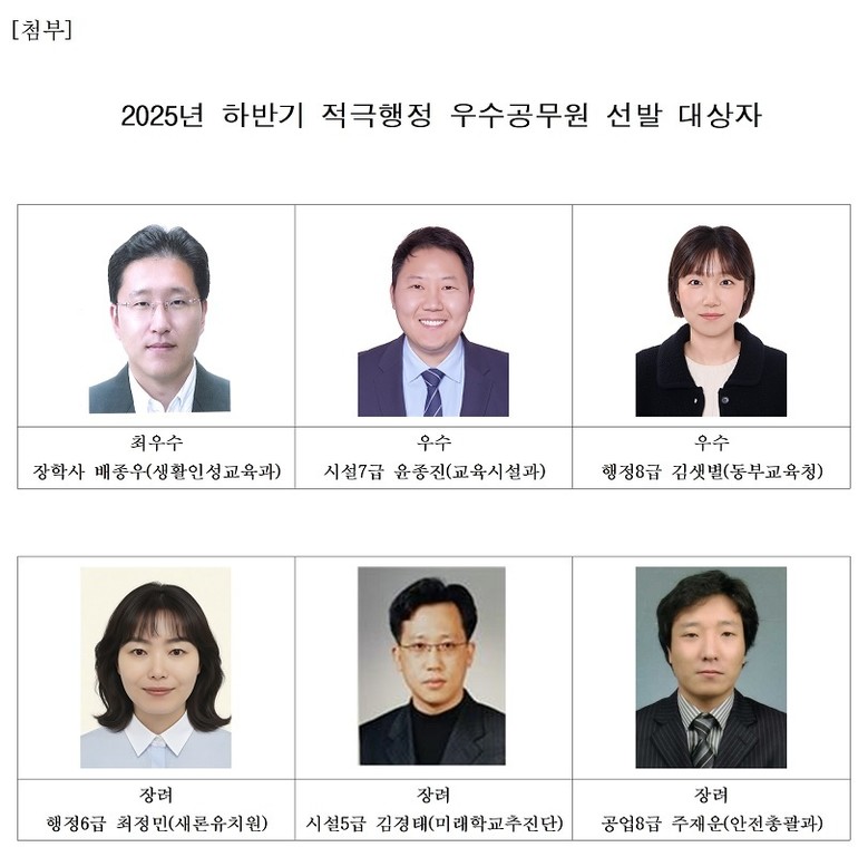우수에는 교육시설과 윤종진 주무관과 동부교육지원청 김샛별 주무관이 선정됐다.