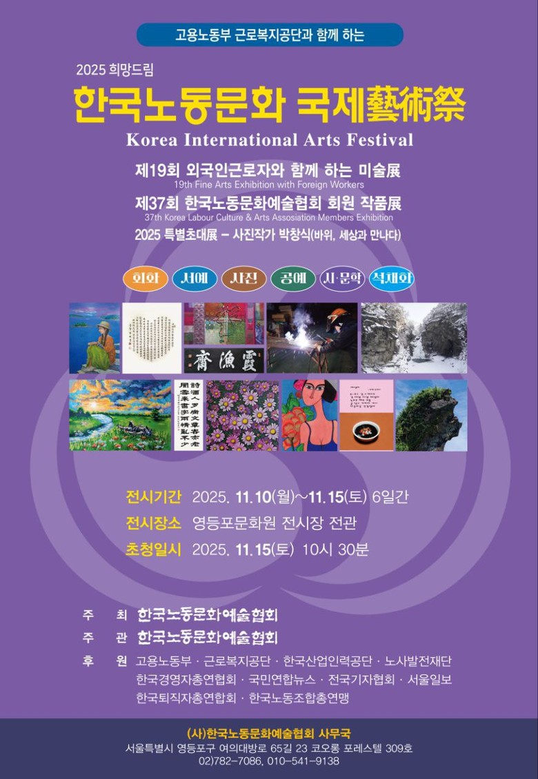 (사)한국노동문화예술협회(이사장 김용수)는 고용노동부 근로복지공단과 함께 「2025 희망드림 한국노동문화 국제예술제」를 11월 10일(월)부터 15일(토)까지 6일간 영등포문화원 전시장 전관에서 개최한다.