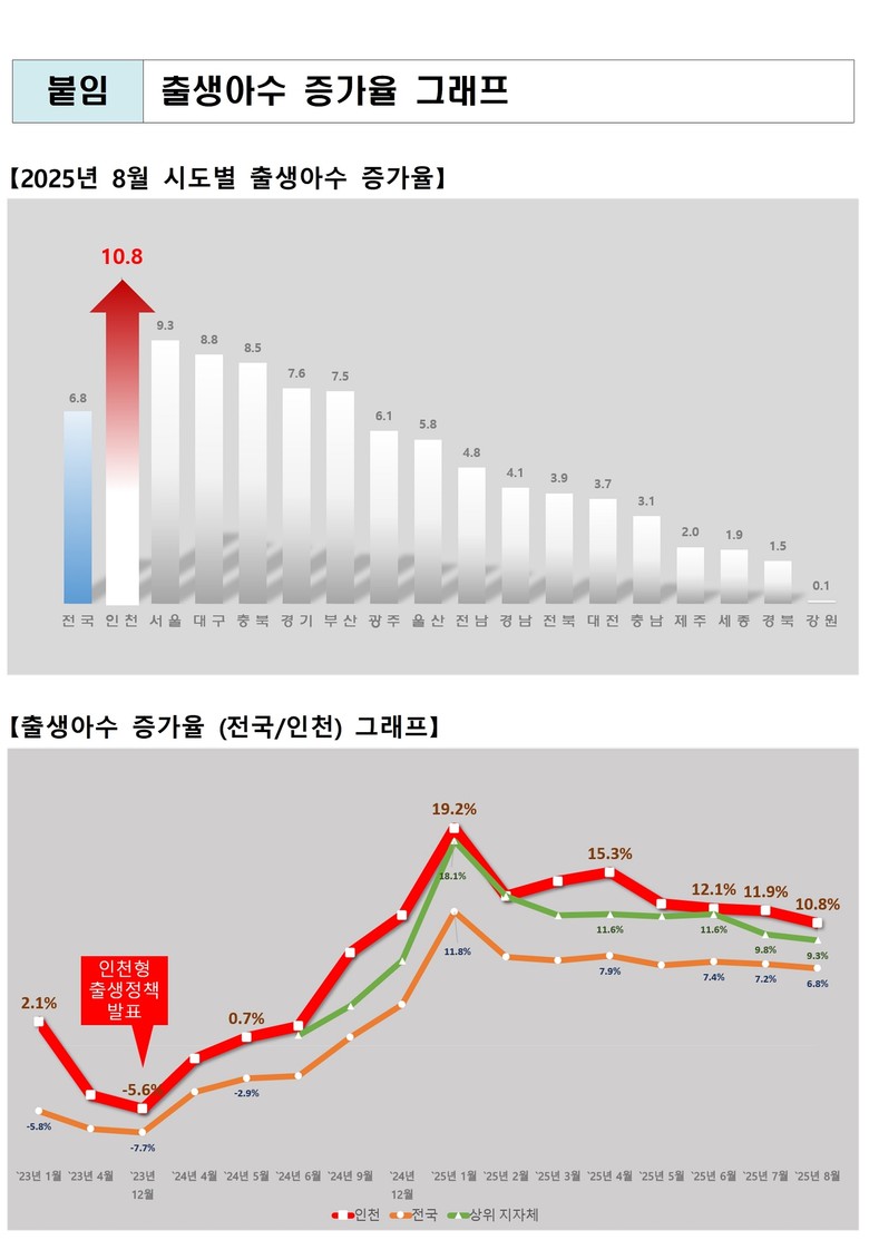 통계청이 발표한 ‘2025년 8월 인구동향’에 따르면, 인천시는 1월부터 8월까지 출생아 수가 전년 같은 기간보다 10.8% 늘어나 전국 17개 시·도 가운데 가장 높은 증가율을 보였다. 이는 전국 평균을 크게 웃도는 수치로, 수도권 내에서도 서울(9.3%), 경기(7.6%)를 앞질렀다. 대부분 지역이 한 자릿수 증가율에 머문 가운데, 인천은 유일하게 두 자릿수 상승세를 이어가며 수도권은 물론 전국의 출생률 회복 흐름을 주도하고 있다.