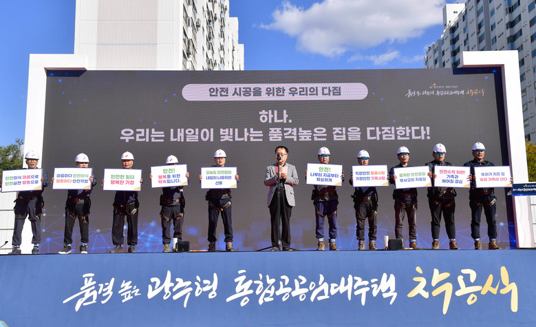 또 시공사인 ㈜유탑건설과 브이산업㈜, 감리사인 ㈜목양건축사사무소 관계자들의 철저한 안전시공과 무사고를 기원하는 안전시공 다짐 퍼포먼스도 진행됐다.