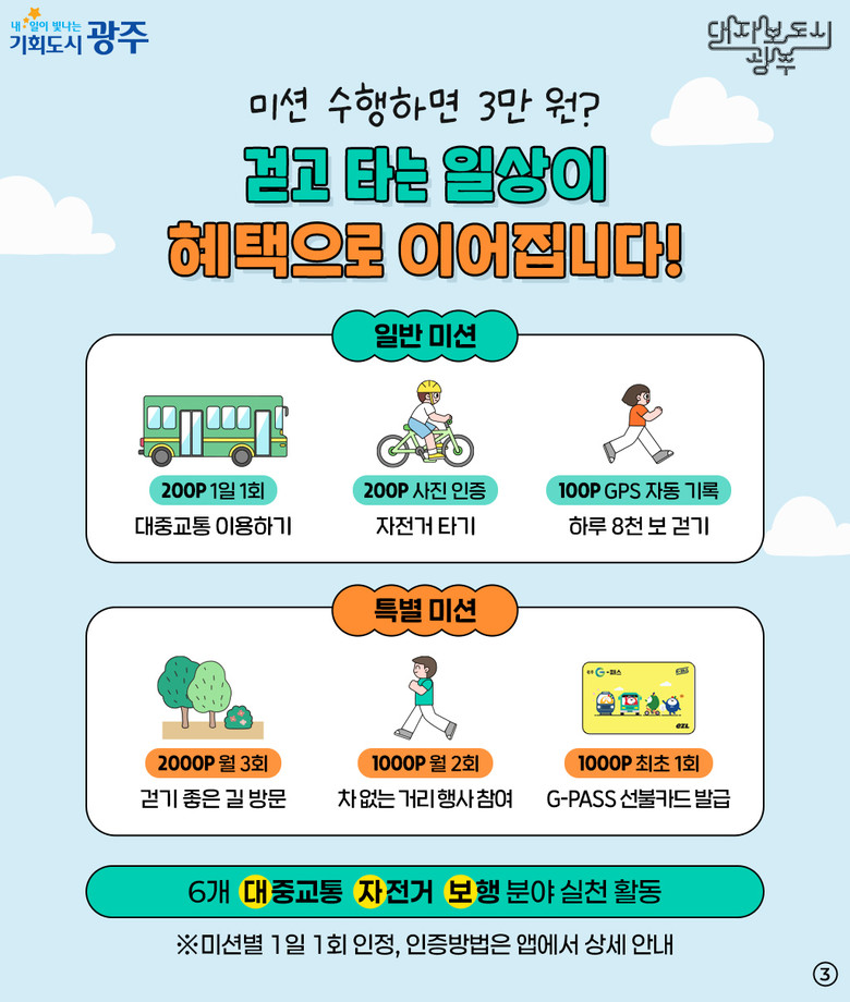 광주 시내버스나 도시철도를 이용하면 회당 200포인트, 자전거를 이용하면 200포인트, 하루 8000보 이상 걸으면 100포인트를 적립해준다. 포인트는 현금처럼 환산돼 모바일 온누리상품권으로 지급된다. 시범운영기간 최대 3만포인트까지 적립할 수 있다.