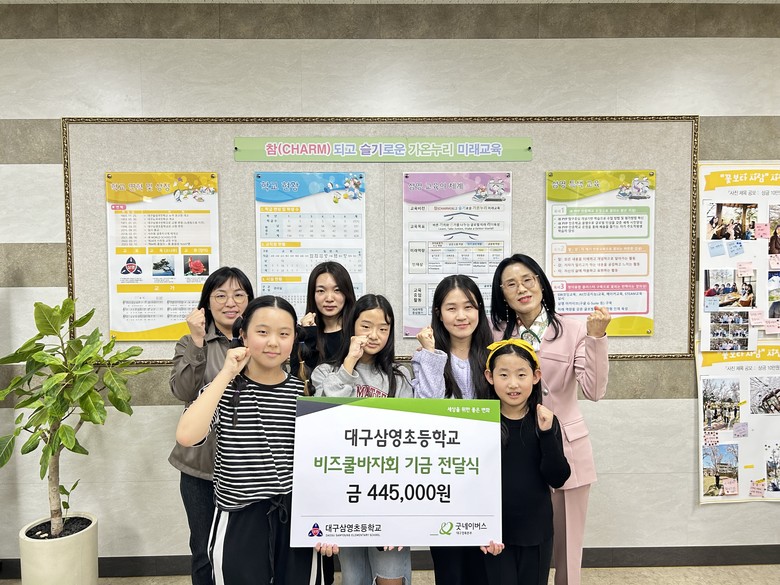 삼영초 학생들은 2023년 1학기 창업동아리 운영 수익금 약 40만원을 기부한데 이어, 이번 2학기 창업동아리 장터 수익금 445,000원 전액을 굿네이버스 대구지부에 기부하며 친구들과 함께 나눔의 가치를 공유하고 실천했다.