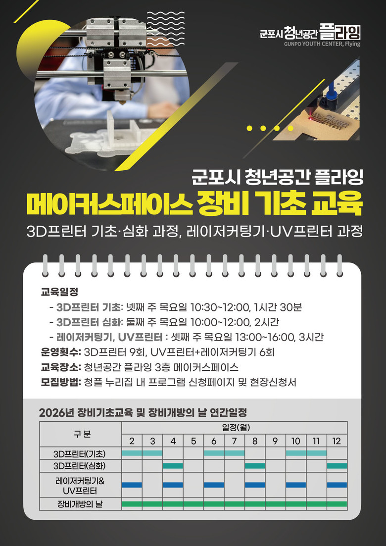 하은호 군포시장은 “이번 교육과 장비개방 프로그램을 통해 청년들이 메이커 장비를 보다 안전하고 실질적으로 활용할 수 있는 환경을 조성하고자 한다”며 “아이디어 구현부터 시제품 제작까지 이어지는 창작 활동의 기반이 되길 기대한다”고 전했다.